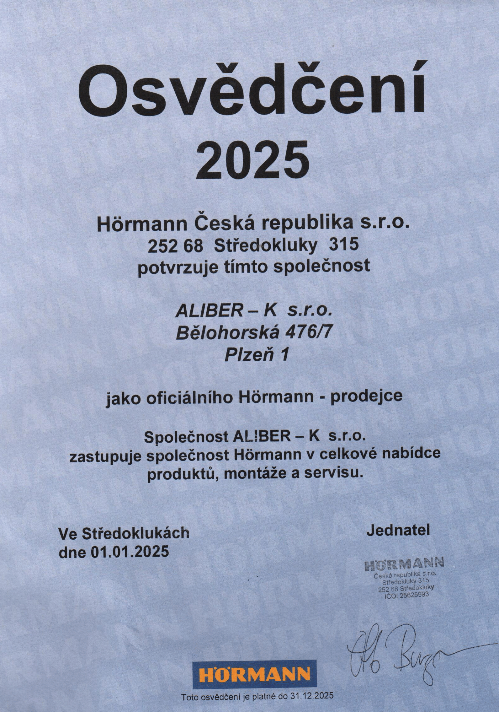 dovolujeme si Vám představit společnost Aliber-k, s.r.o., která byla založena v roce 2011. Od svého vzniku působíme jako výhradní dodavatel kompletního programu značky Hörmann, světového lídra v oblasti privátních a průmyslových garážových vrat, vchodových a interiérových dveří a pohonů bran.